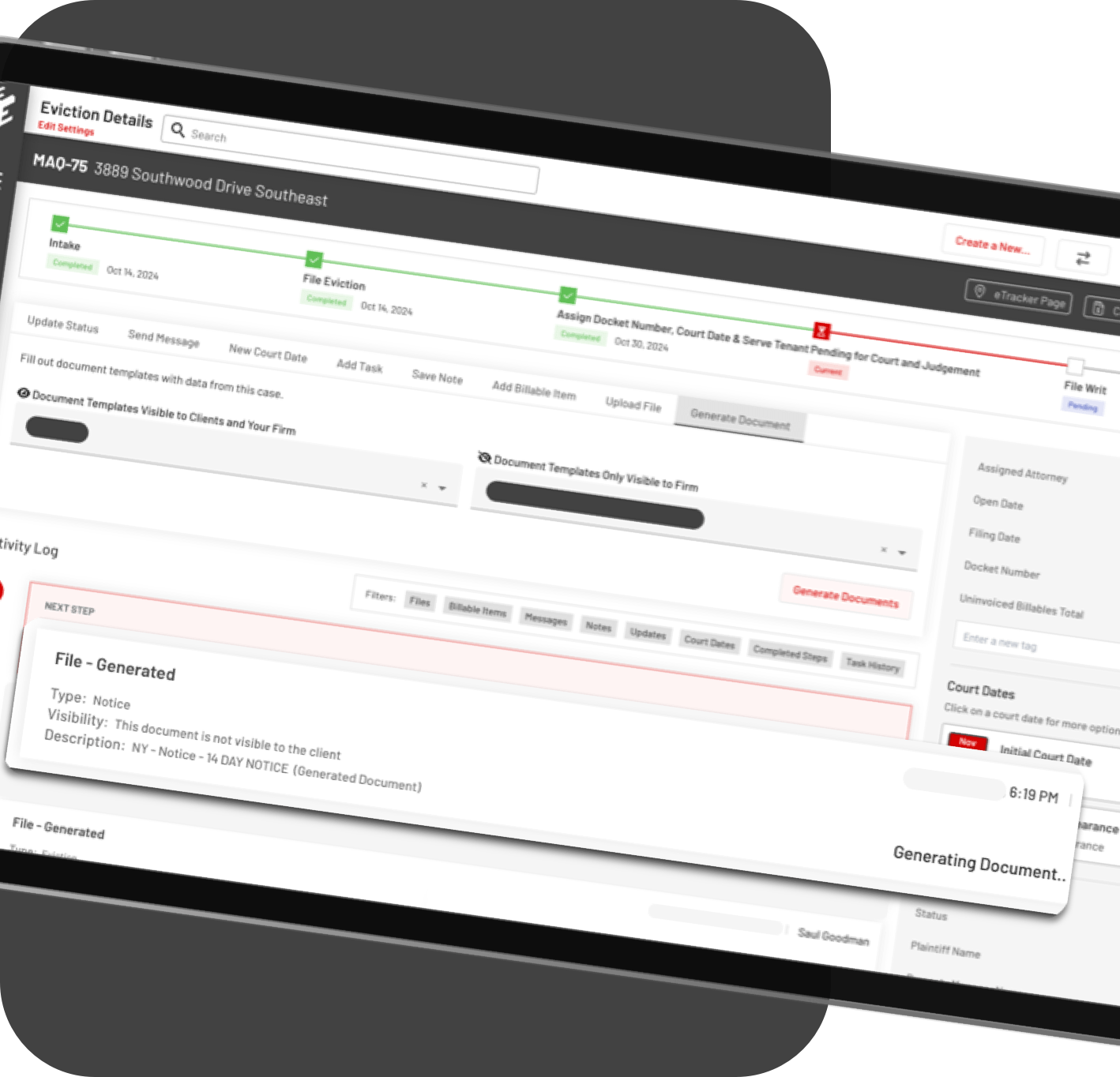 EasyEviction simplifies the eviction process, providing you with increased efficiency and visibility. With automatic notifications, tracking, billing, and more built into the program, the eviction process will never be the same — and that’s a good thing for both attorneys and their property manager clients.